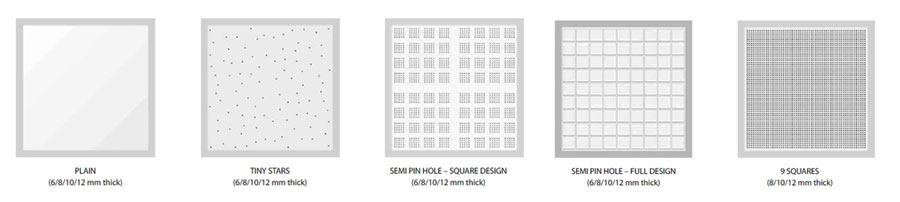 | TILES | 595 x 595 mm | 610 x 610 mm | 1195 x 595 mm | 1220 x 610 mm | 6, 8, 10, 12 mm |